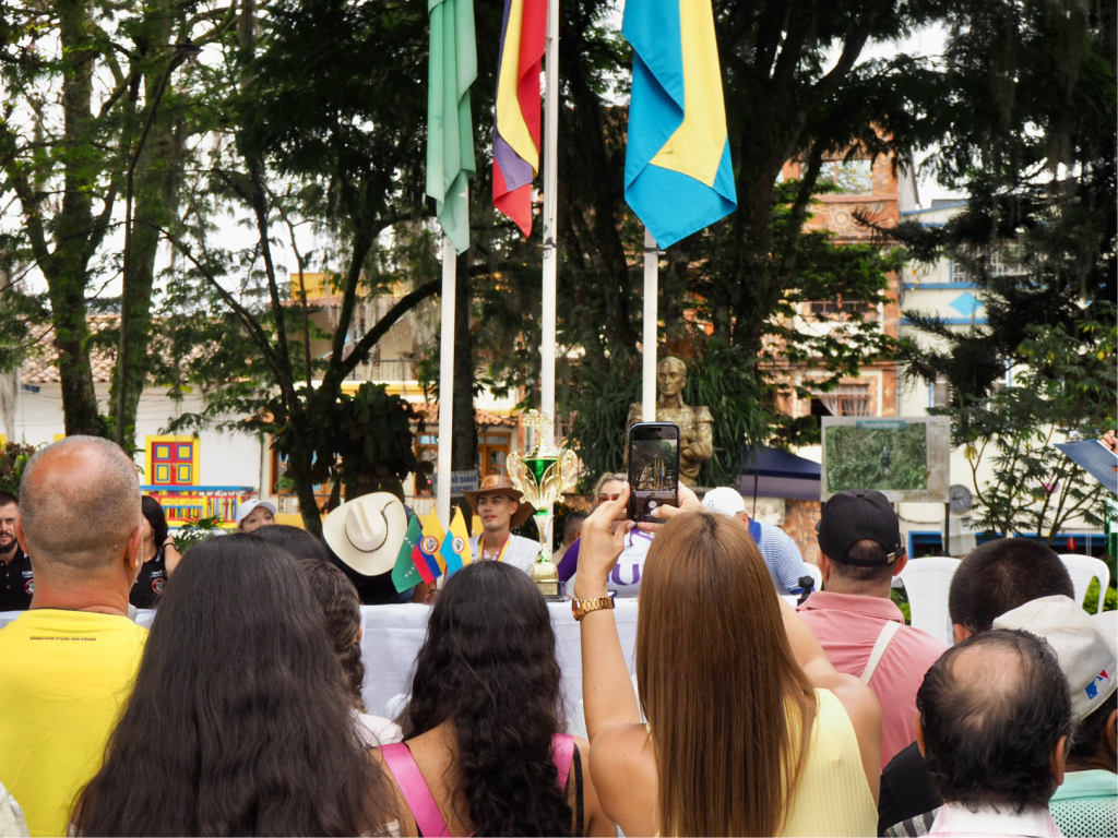 Santuario, ein kleiner Ort an der östlichen Flanke der Cordillera Occidental, nördlich von Pereira. Hier buchen wir uns in eins der beiden Hotels ein und als wäre der Partykrach am Hauptplatz von Salamina nicht gewesen, entscheiden wir uns für das schöne Hotel Santuario Plaza. Der Name verrät es bereits, es liegt am Dorfplatz. Und wieder hält sich unser Irrglaube, dass am Sonntag sicher früh abends Ruhe einkehren wird. Nein, natürlich nicht. Am Nachmittag ein buntes Treiben mit Ehrung des Kolumbianischen Rennradfahrers William Colorado, der sich den Straßentitel der U 20 in Kolumbien gesichert hat, und in Santuario geboren wurde. Ein regionaler Nationalheld.