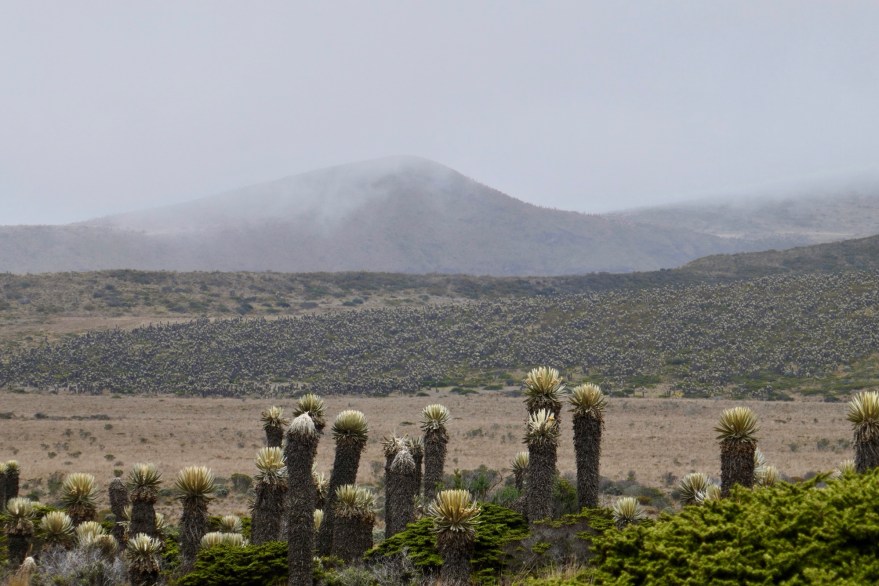 Nach dem Mittag-Lunch mit Reis und Eiern wandern wir durch den Paramo und den Nebelschwaden, was eine geheimnisvolle Atmosphäre hervorruft. Der Name der stehenden Korbblüter, Freilejones, geht auf die spanischen Entdecker zurück, die in ihnen im Nebel einen „Kapuziner-Mönch“ sahen, einen „Fraile capuchino“.