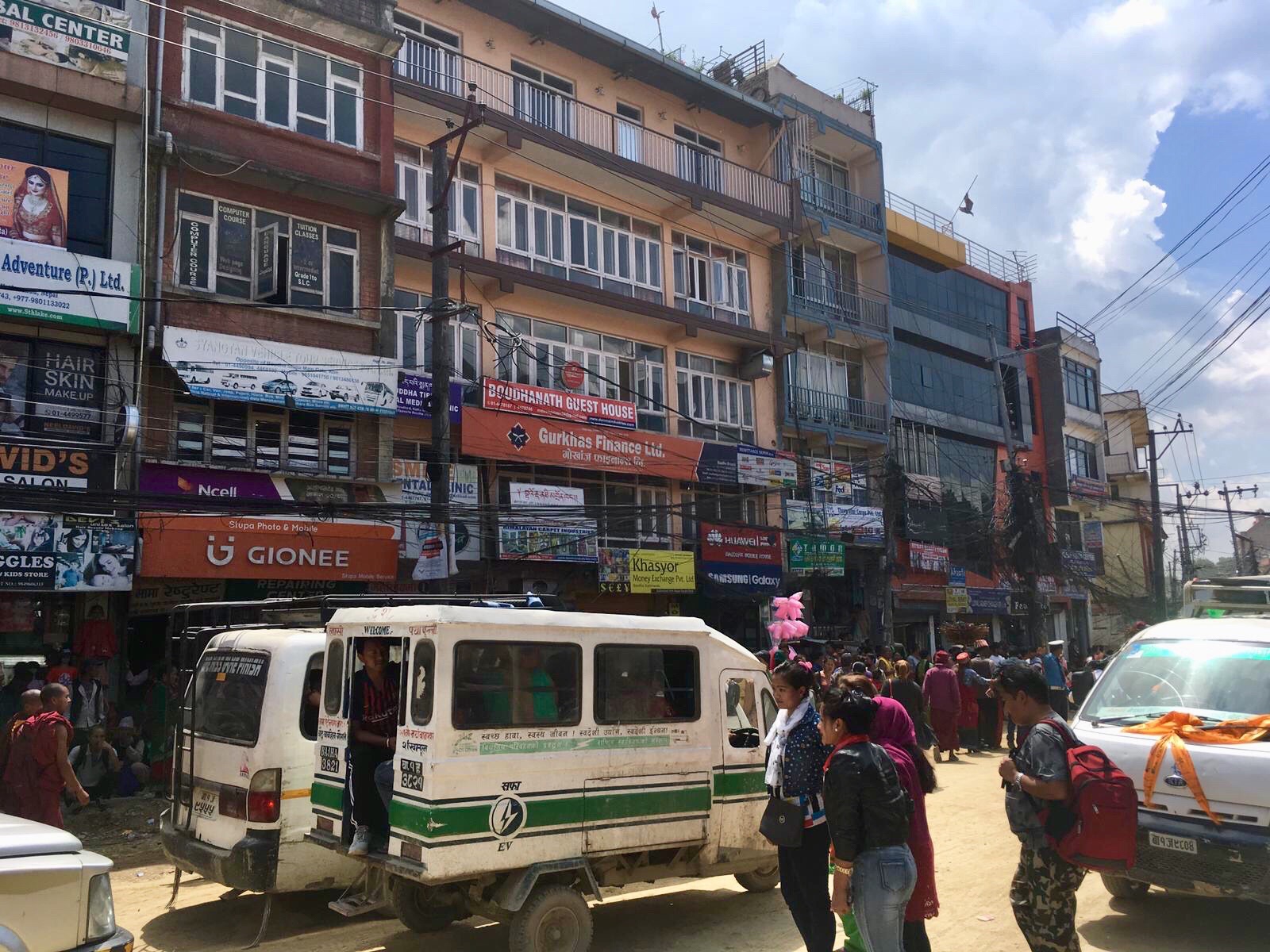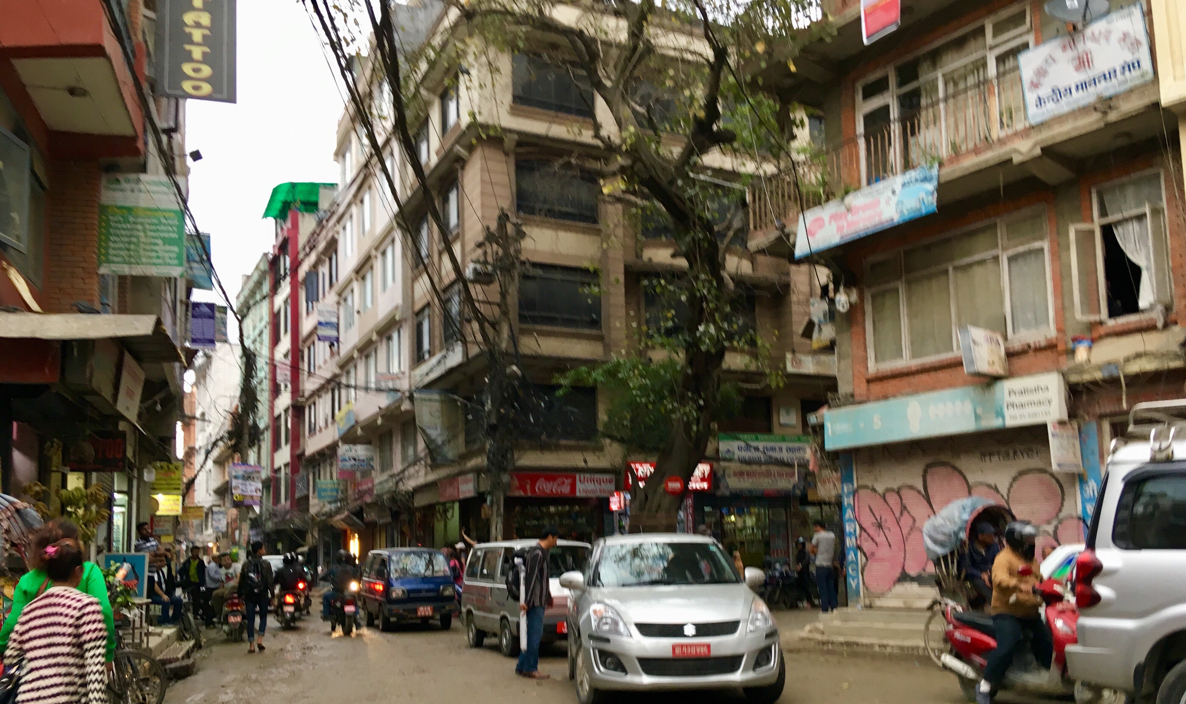 Plötzlich taucht eine Brass-Band in einer Gasse auf. Ein Bannerträger geht voran. Sie ziehen stoisch durch das Verkehrschaos. Blumenträger folgen, dann ein geschmücktes Auto, in dem ein Brautpaar sitzt. Die Motorräder kämpfen sich auch um diesen komischen Aufzug herum. Er geht unbeirrbar seinen Weg mit scheppernder Musik, zieht durch den kleinen Kreisel, in dessen Mitte eine eingegitterte Stupa steht, die vor lauter Dreck und Taubenschiss kaum noch zu erkennen ist.