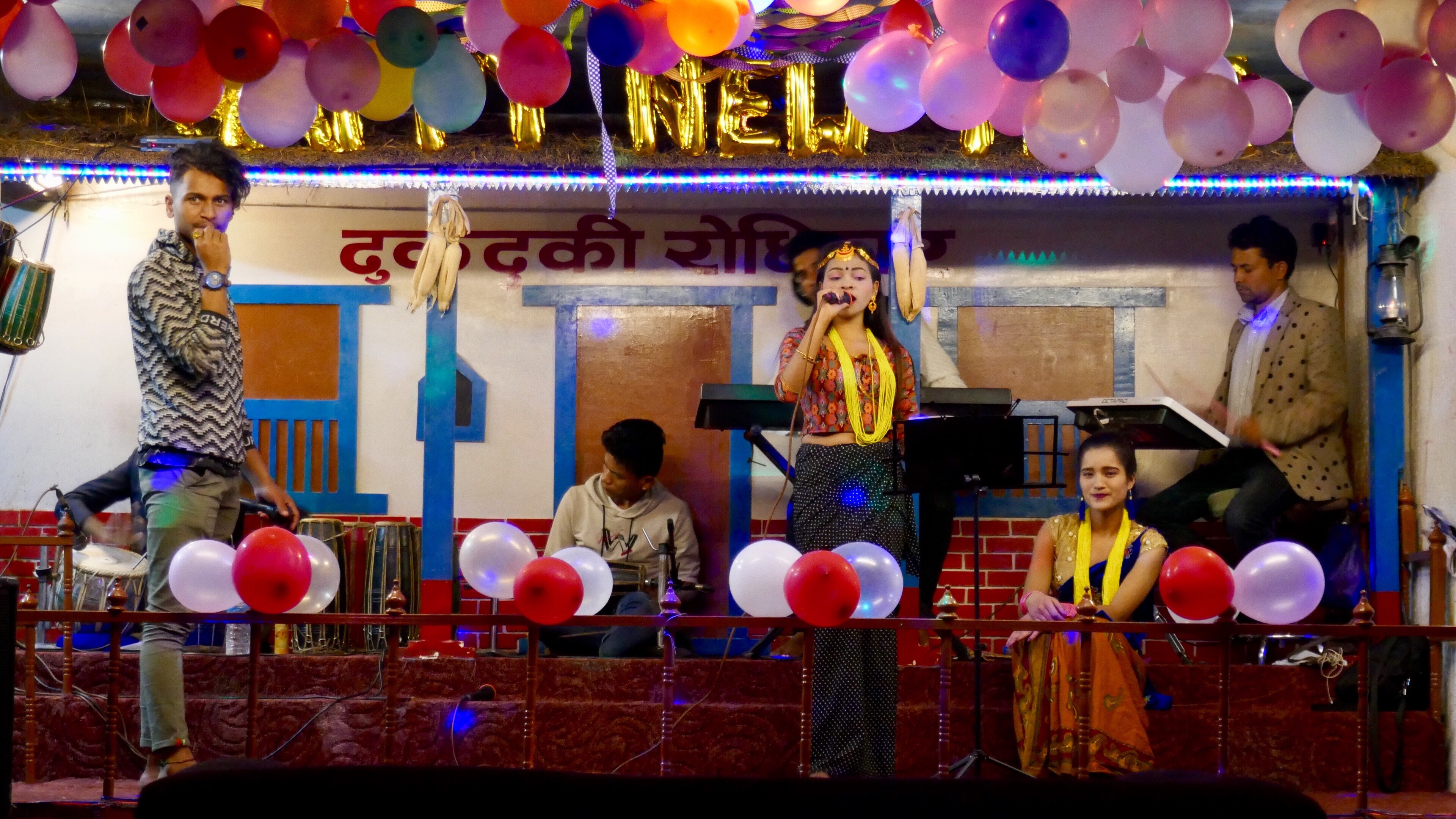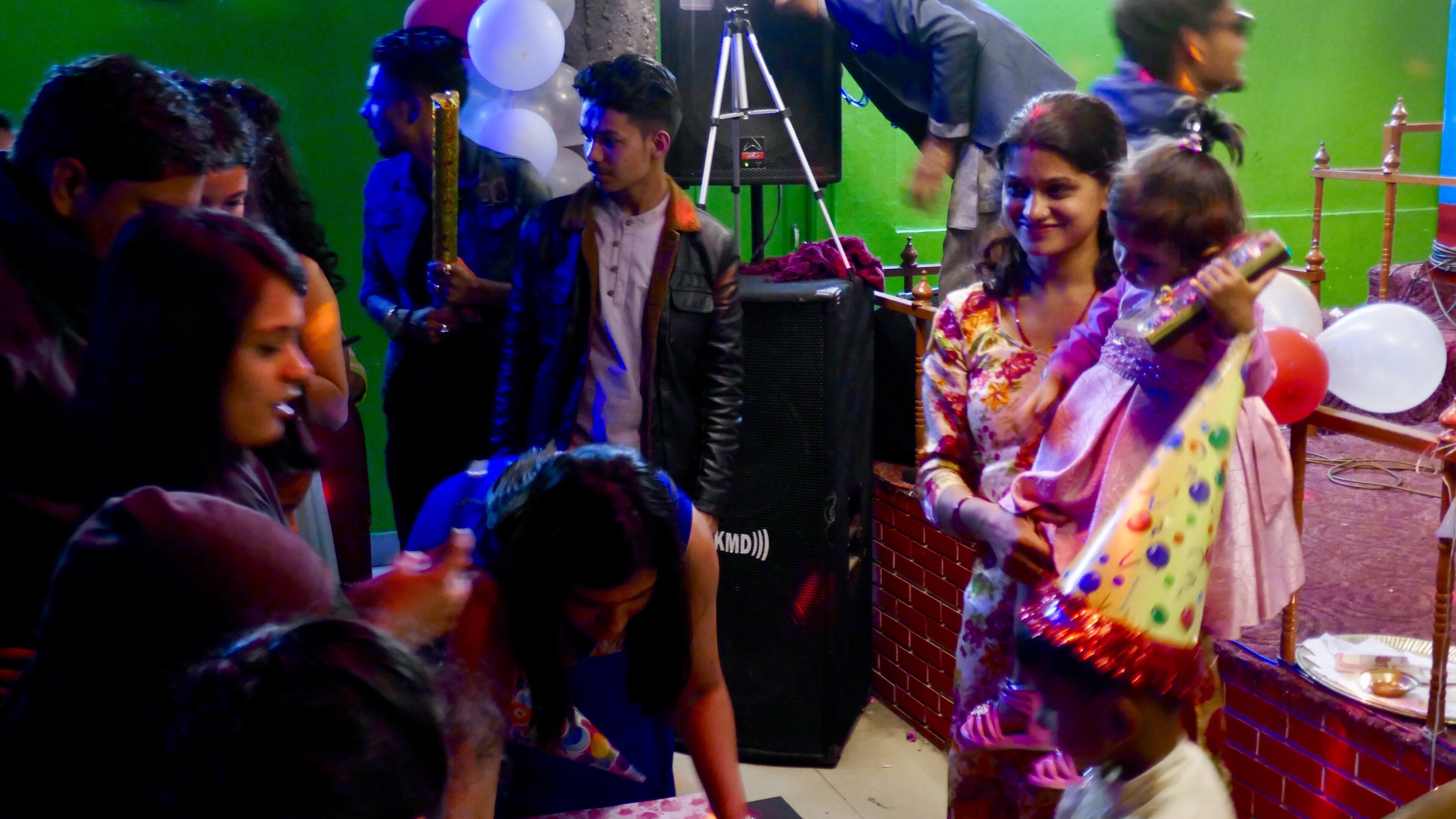 An einem Abend werden wir zu einer Familienparty des Yoga-Lehrers in unserem Hostel in Kathmandu eingeladen. Wir fahren aus der Kernstadt hinaus, über das Botschaftsviertel hinaus, am Union Jack der US-Embassy vorbei und halten vor einem Büroklotz. Über Steinhaufen hinweg steigen wir aus dem Taxi und folgen unserem Yoga-Lehrer über einen schmalen gefliesten Weg in das Gebäude. Wir steigen über ein dunkles Treppenhaus in den dritten Stock und betreten eine Art Fabriketage, die zu einem Partyraum umfunktioniert wurde. Ein wenig später spielt eine nepalesische Band traditionelle Musik, die sich für unsere Ohren recht fremd anhört. Schöne Frauen in bunten Kostümen singen mit hohen Stimmen und wechseln mit den Männern ihre Text-Geschichten ab. Die große Familie trudelt langsam ein und begrüßt sich liebevoll. Alles wirkt zwar fremd, aber doch vertraut. Die Verständigung ist schwierig, da kaum jemand Englisch spricht, aber wir werden herzlich aufgenommen.