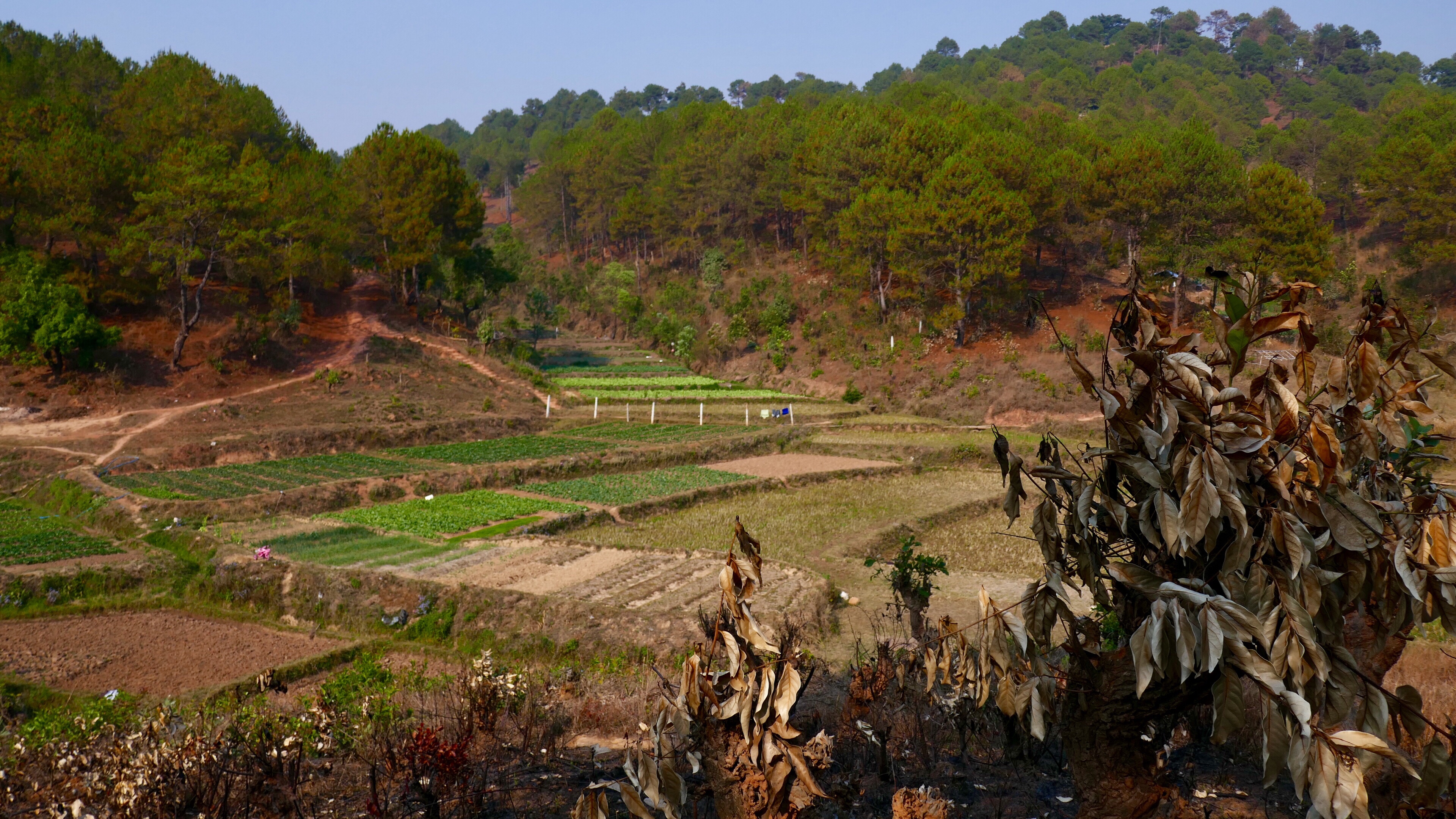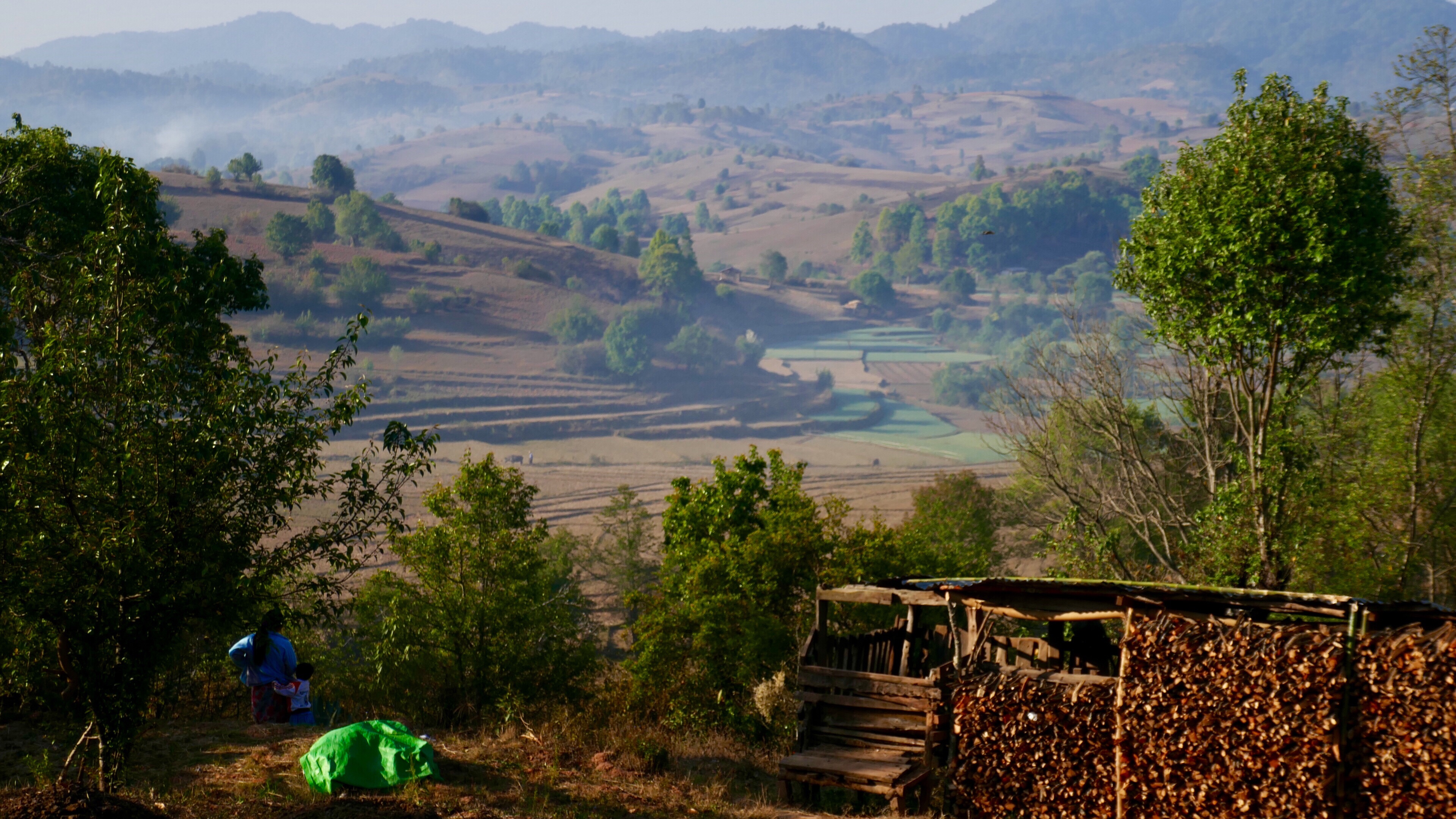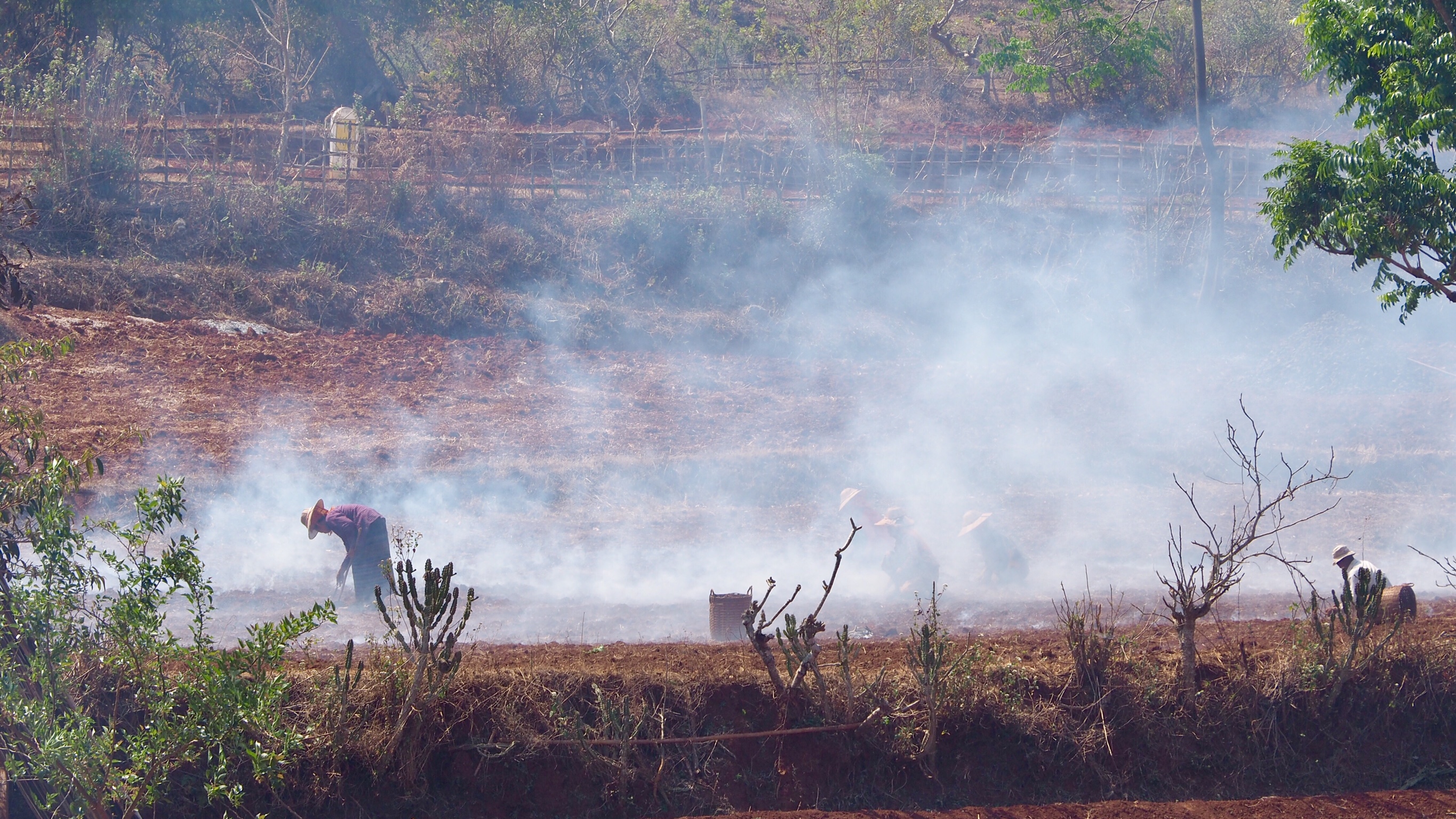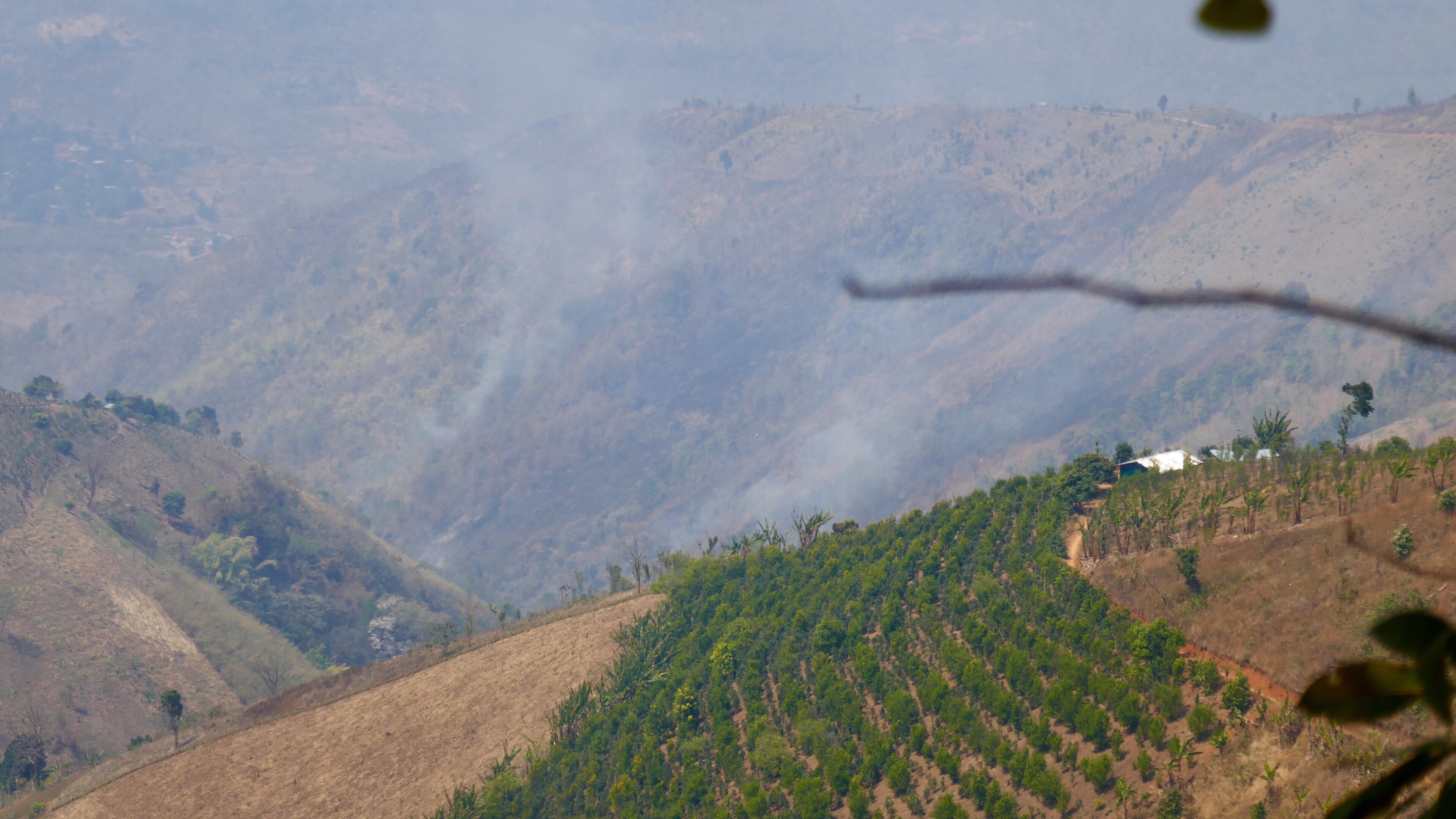 Nach den Feldern rund um Kalaw kommen wir in den grünen tropischen Wald in Richtung des Stausees zur Wasserversorgung der Stadt. Das Wasserwerk wurde erst 2016 mit Hilfe Japans gebaut, mir ist rätselhaft, wie vorher die Wasserversorgung ohne die Filterbecken aussah. Durch üppig grünen Wald geht es stetig nach oben. Oben am Kamm der Berge angekommen, eröffnet sich uns ein weiter Blick nach Süden über große Teeplantagen. Nur: der Wald ist komplett weg, stattdessen brennen überall die Feuer. Ganze Bergrücken werden abgefackelt. Wie es vermieden wird, dass auch die bestellten Plantagen oder die die Häuser niederbrennen, kann uns Than auch nicht sagen. Trotz des tollen Blickes gehen die Aschestücken auf uns nieder und trüben die Stimmung. 10-15% des Klimawandels gehen auf das Konto von Brandrodung (1).