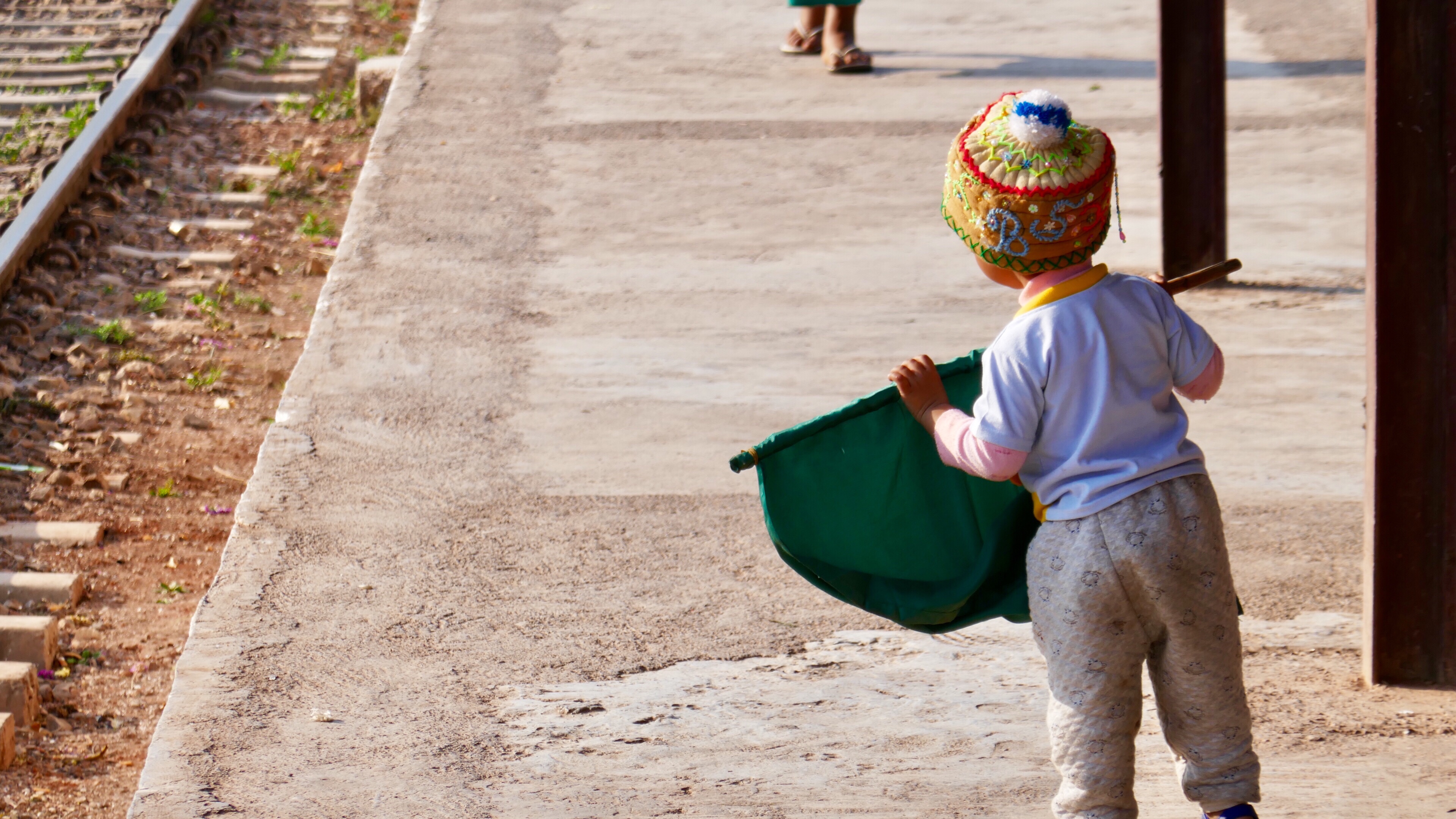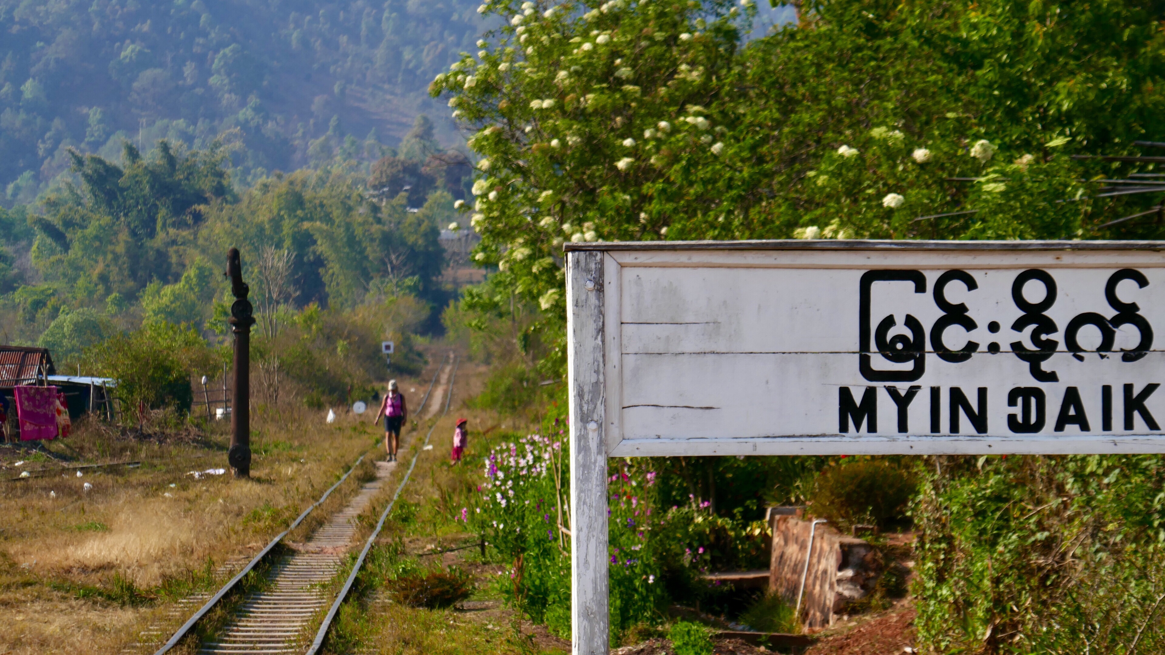 Nach einiger Zeit treffen wir auf die Bahngleise. Die Bahnlinie führt von Taunggyi nach Yangon. Die Schritte immer genau auf die Schwellen zu setzen ist gar nicht so leicht. Die Abstände sind nie gleich. Da konzentrieren wir uns lieber auf den Schritt als in die Landschaft zu schauen. Mit dem Schwellenschritt erreichen wir Myndeik, im Bahnhof gibt es erstmal Tee im Laden/Restaurant/Wohnzimmer ? des Bahnhofsvorstehers. Sein Sohn spielt währenddessen mit den Flaggen des Vaters, rot und grün. Von hier aus kann man mit dem Zug nach Yangon fahren, wenn man genügend Zeit und Geduld mitbringt.