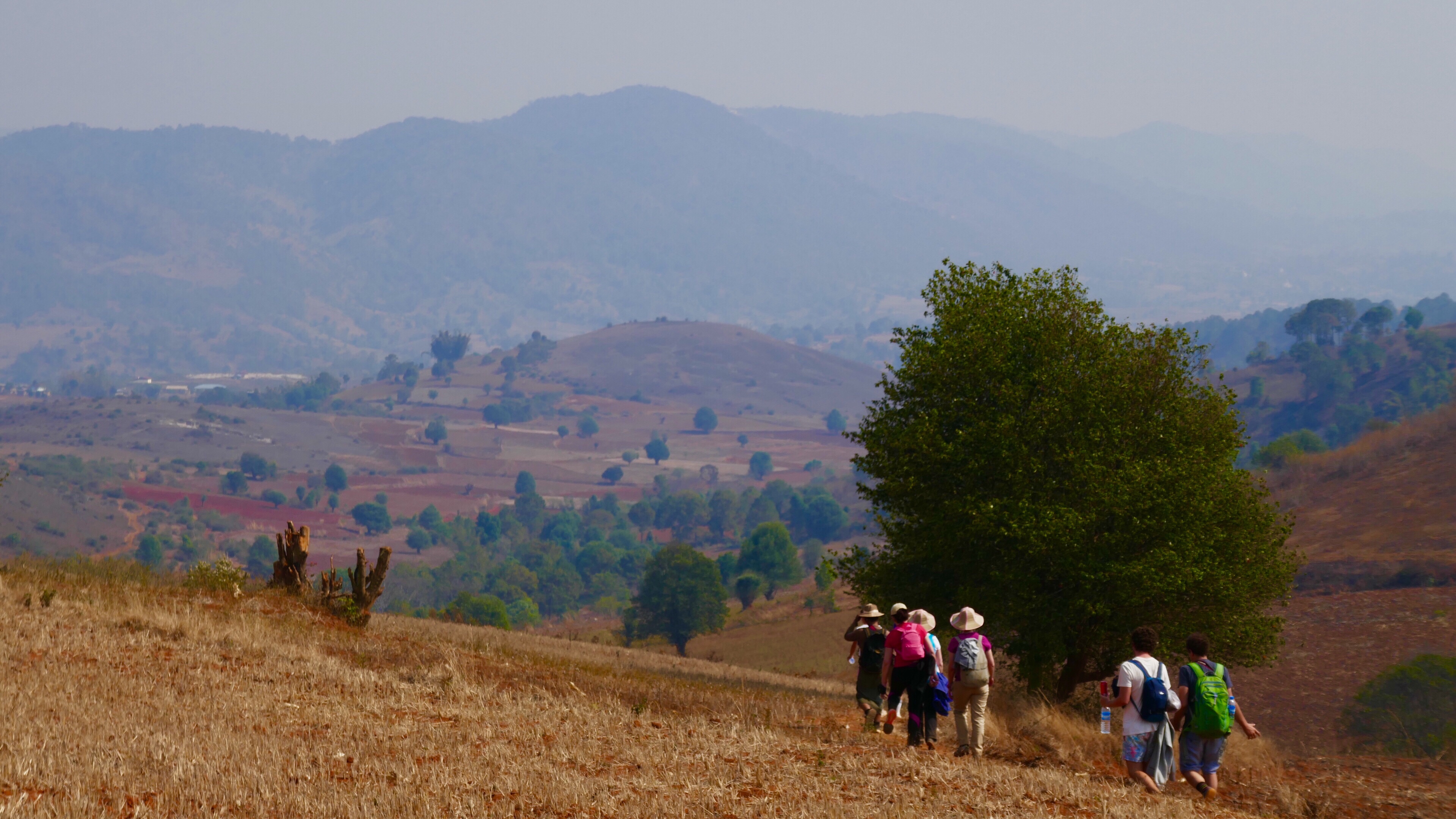 Nur in der Ferne registrieren wir die kahlen Berge. Auf der letzten Etappe sind wir durch ein extrem trockenes Tal gewandert. Hier waren nur noch niedrige Bäume und Buschwerk vorhanden. Sicher stand auch hier mal tropischer Wald. Wir erfahren, dass 80% des Teakholz-Bestandes von Myanmar in der Zeit der Militärdiktatur abgeholzt wurde. Das Holz wurde als Devisenbringer ins Ausland verkauft, die Profite von den Konzernen der Generäle einkassiert. Neben dem ökologischen Raubbau auch ein Diebstahl am eigenen Volk. Und dieses System aus Korruption und Bereicherung scheint auch heute noch weiterzugehen. Ich lese auf tagesschau.de einen Bericht, dass die Renovierung des Segelschiffes „Gorch Fock“ der Bundeswehr mit illegalem Teak-Holz aus Myanamr erfolgte.