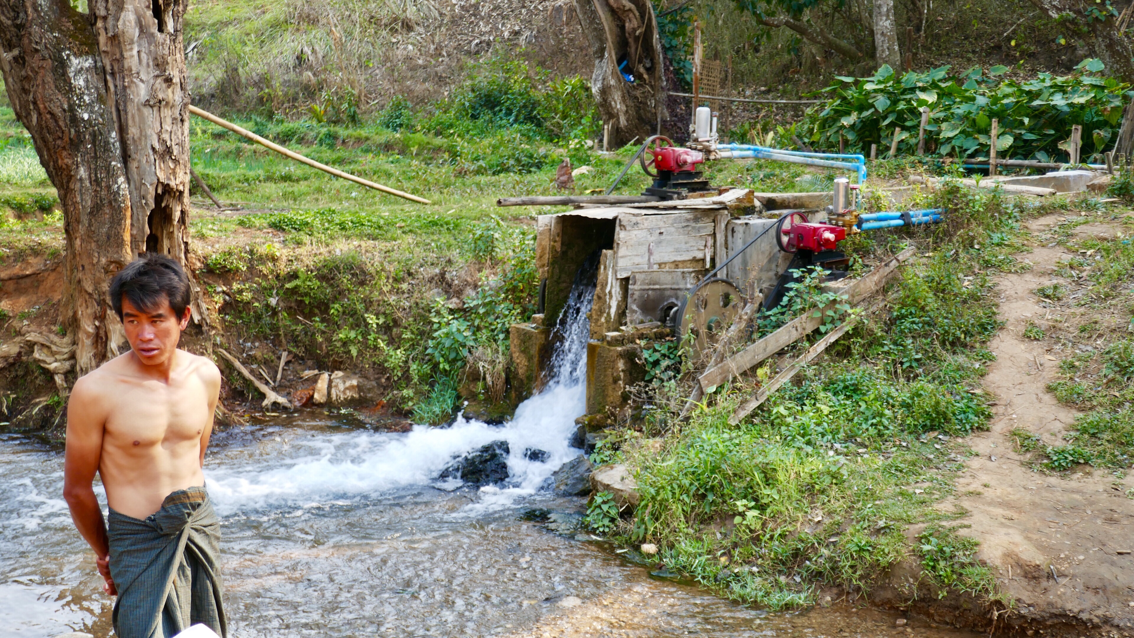 Aus der Quelle wird ein kleiner Fluss, der aus dem trockenen Tal eine grüne Oase macht. Pumpen befördern das Wasser auf die Felder. Über den Fluss kann man über wackelige Bambusbrücken das Ufer wechseln. An einem flachen Uferabschnitt können wir baden. Birmesen haben keine Badehosen oder Bikinis, hier wird traditionell im Longi gebadet.