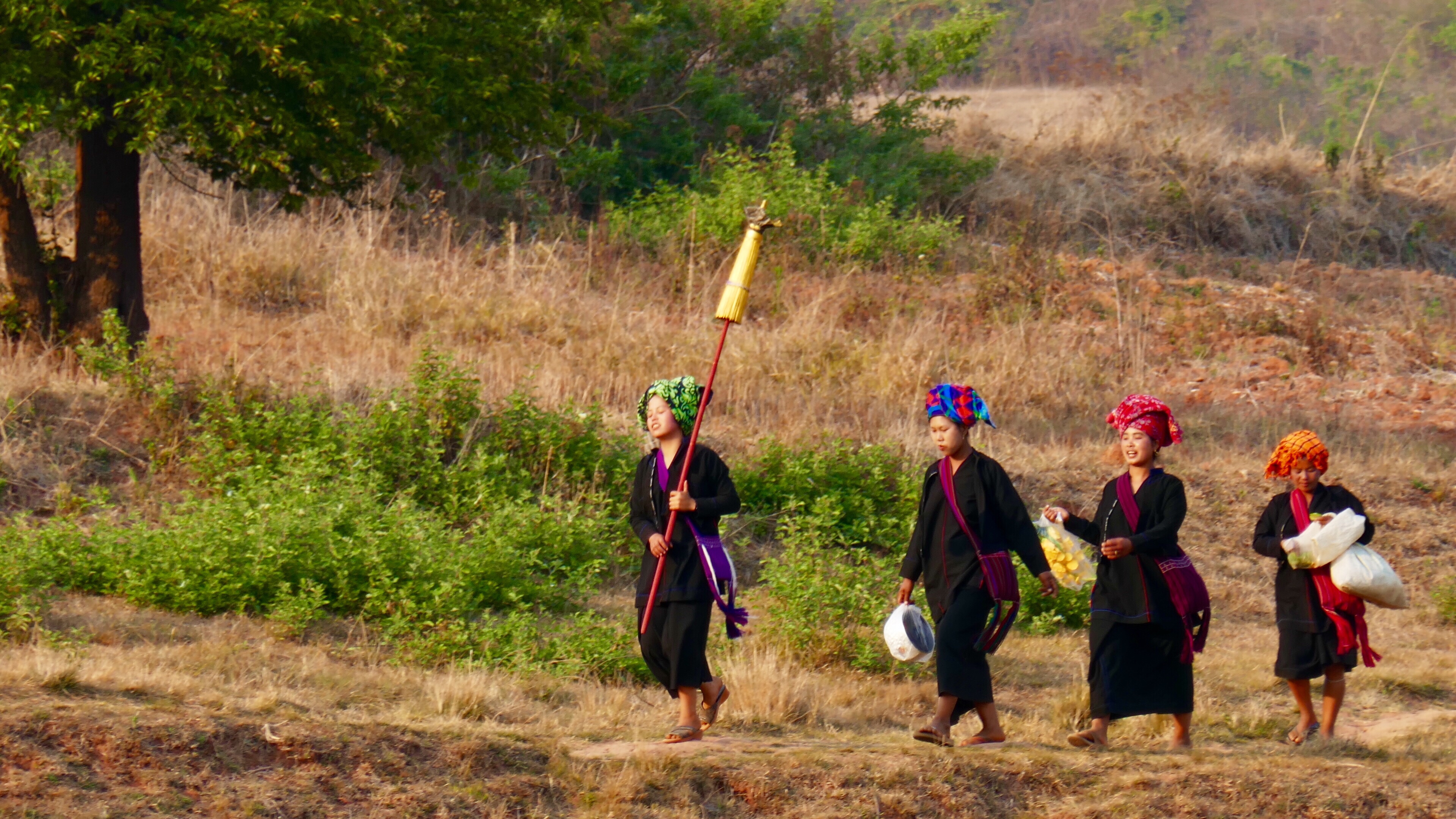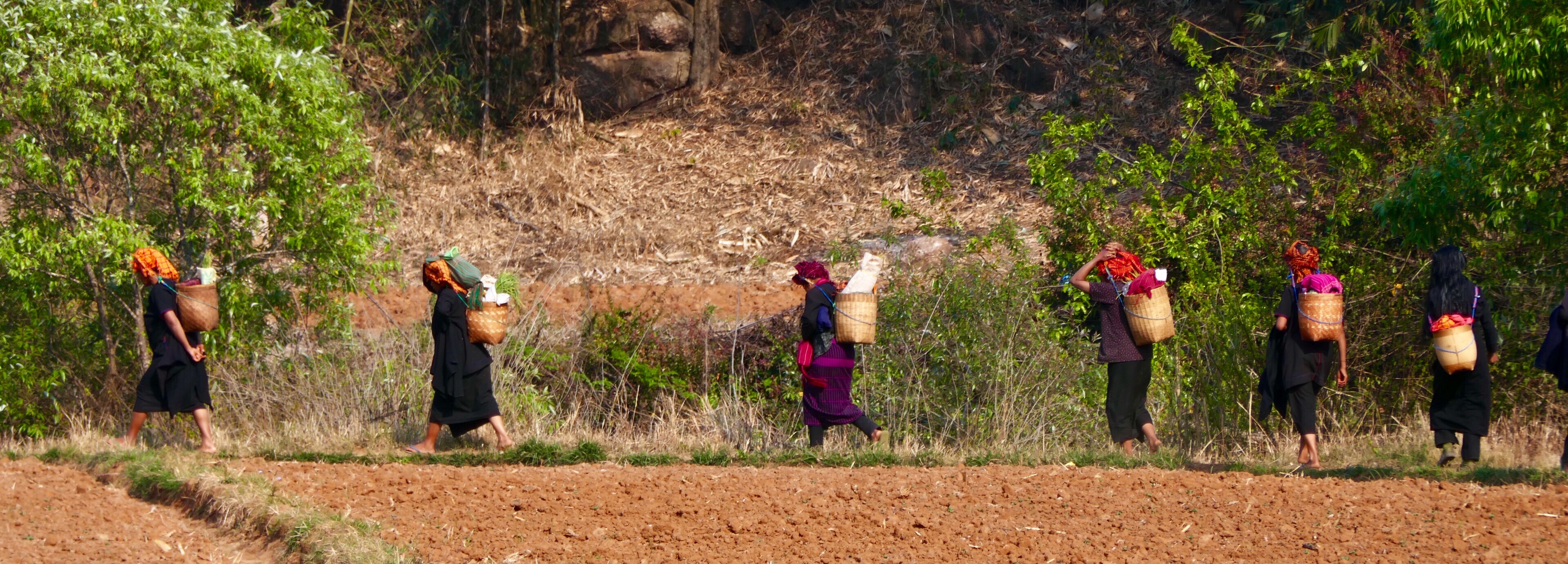 Uns kommt eine große Frauengruppe entgegen, alle Altersstufen. Alle im gleichen Pao-Schwarz gekleidet. Sie schauen uns aus hübschen Gesichtern an. Sie kommen von einer Hochzeitsfeier. Männer und Frauen gehen getrennt. Dann können die Männer ungestört trinken. Sie fragen uns, ob wir nicht müde seien von der ganzen Wanderung. Than übersetzt für uns. Unter einem Baum sitzen sieben alte Frauen. Sie sind auch alle im traditionellen Schwarz gekleidet. Sie gehen auf eine Beerdigung. Die meisten haben kaum noch Zähne im Mund. Sie wirken schon sehr alt, laut Than sind sie wohl erst Mitte sechzig. Das Leben mit der Arbeit auf dem Feld ist wohl sehr zehrend. Aber sie sehen sehr würdevoll aus.