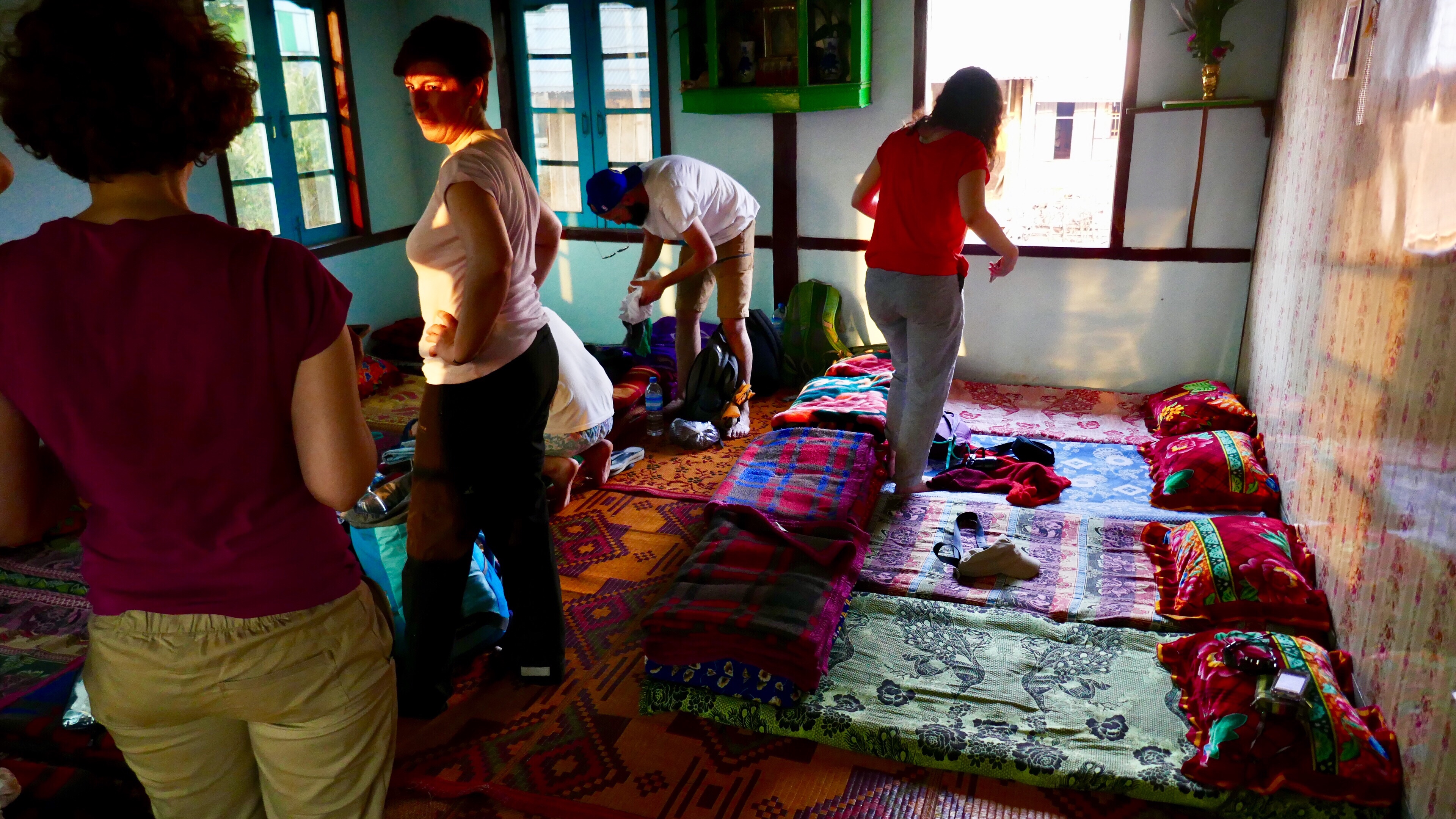 Wir erreichen ein Dorf. Vor einem Haus, das sich nicht von den anderen unterscheidet, biegt Than ein. 21 km haben liegen hinter uns. Wir haben unsere Unterkunft erreicht. Im ersten Stock bekommen wir ein Zimmer mit sechs Schlafplätzen: Reismatten auf dem Boden, je ein Kopfkissen und zwei Decken. Wie im Lager auf einer Berghütte. Die asiatischen Lager sind aber extrem hart. Auch die Badezimmer sind ländlich, ein Wellblechverschlag mit einem Bottich mit Wasser und einer Schöpfkelle. Die Plumpsklos etwas weiter hinten. Der Wasserbüffel steht gleich hinter dem Klo. Die Familie Kocht traditionell in der Mitte ihres Hauses. Die Nacht ist stockdunkel. Ich kann meine Hand nicht vor Augen sehen und muss die Stirnlampe ertasten.