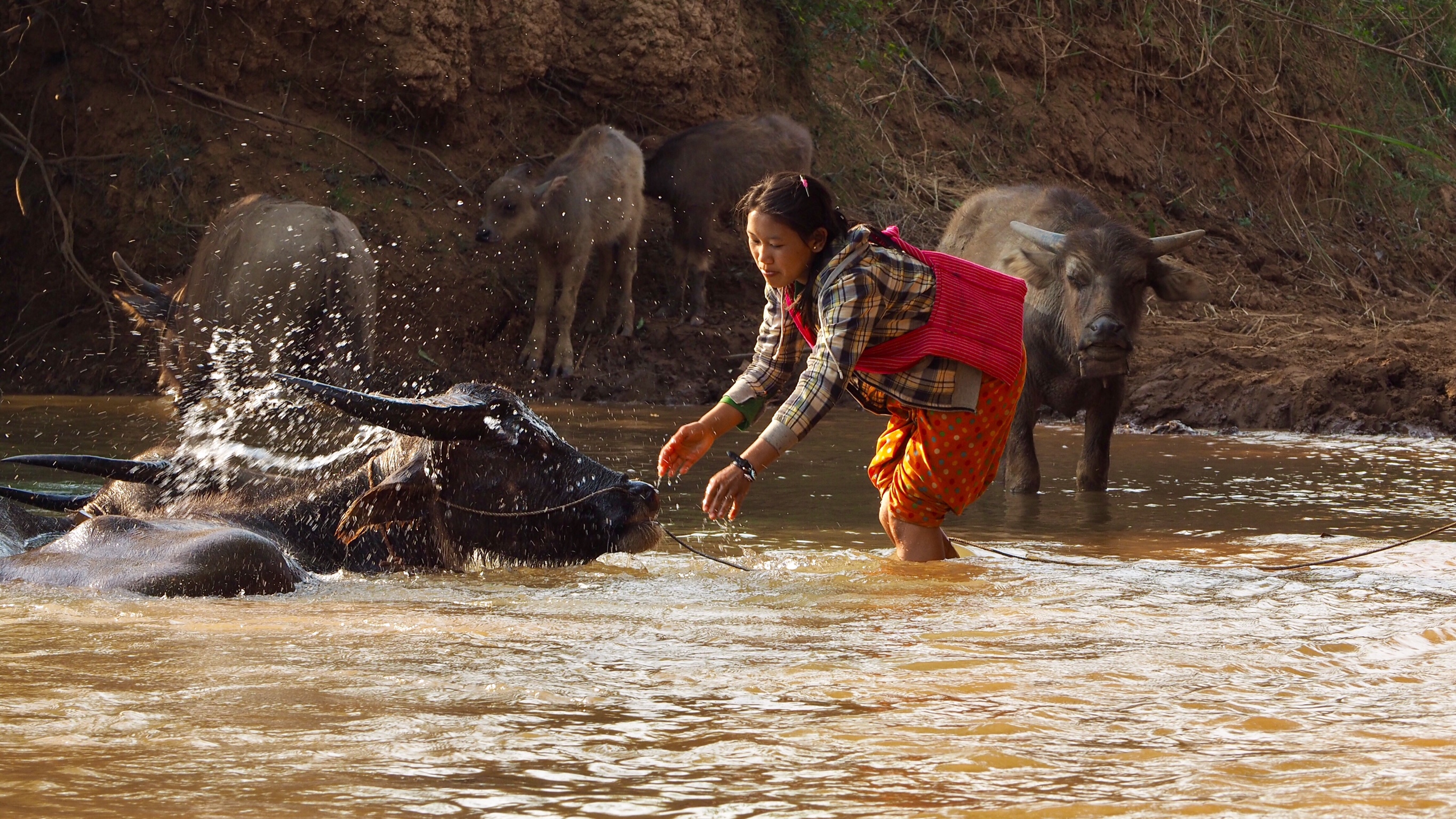 Als wir uns im Wasser abkühlen, kommen Kinder mit einer Herde Wasserbüffel den Pfad hinunter. Die Jungen reiten auf den Tieren. Auch Wasserbüffel lieben das Bad im Fluss, was ihr Name auch vermuten lässt. Ich habe noch nie mit einer Herde Wasserbüffel gebadet. Die Tiere sind jedoch sehr scheu und werden gleich ganz nervös, wenn man sich ihnen zu sehr nähert. Die Kinder nutzen die Gelegenheit zu einem ausführlichen Schwimmen.