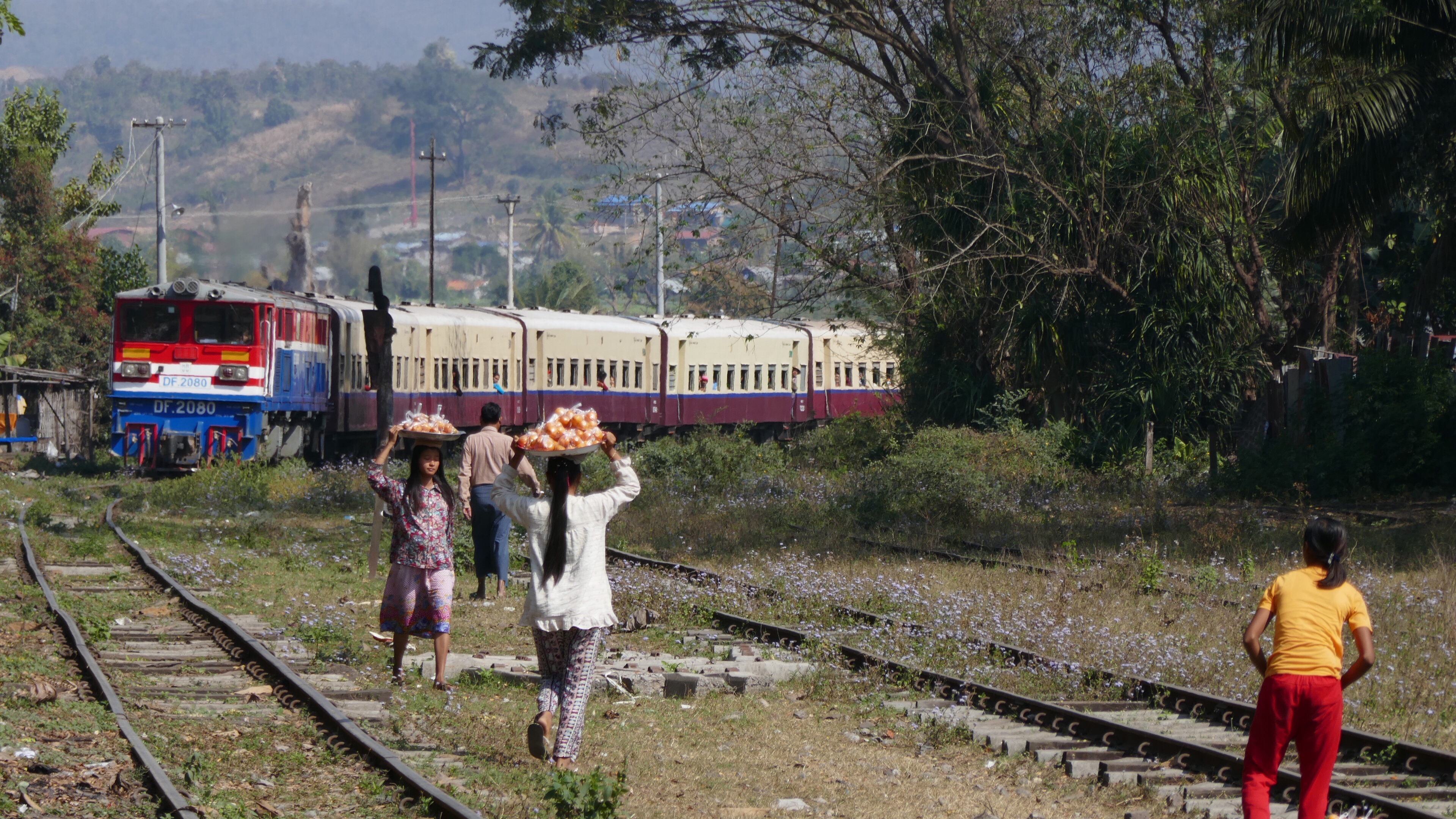 Die Ankunft eines Zuges ist das Ereignis im Dorf. Die Frauen setzen sich in Bewegung, den wenigen Reisenden etwas zu verkaufen: Getränke, Fleischstücken am Spieß, Gemüse für Zuhause oder Blumen für die Pagode oder den häuslichen Schrein. Laut schreiend wird sich auf die Wagonfenster gestürzt und die Ware feilgeboten. Der Zug bleibt lang genug stehen, damit alle Wünsche erfüllt werden. Er hat meist sowieso schon Verspätung.