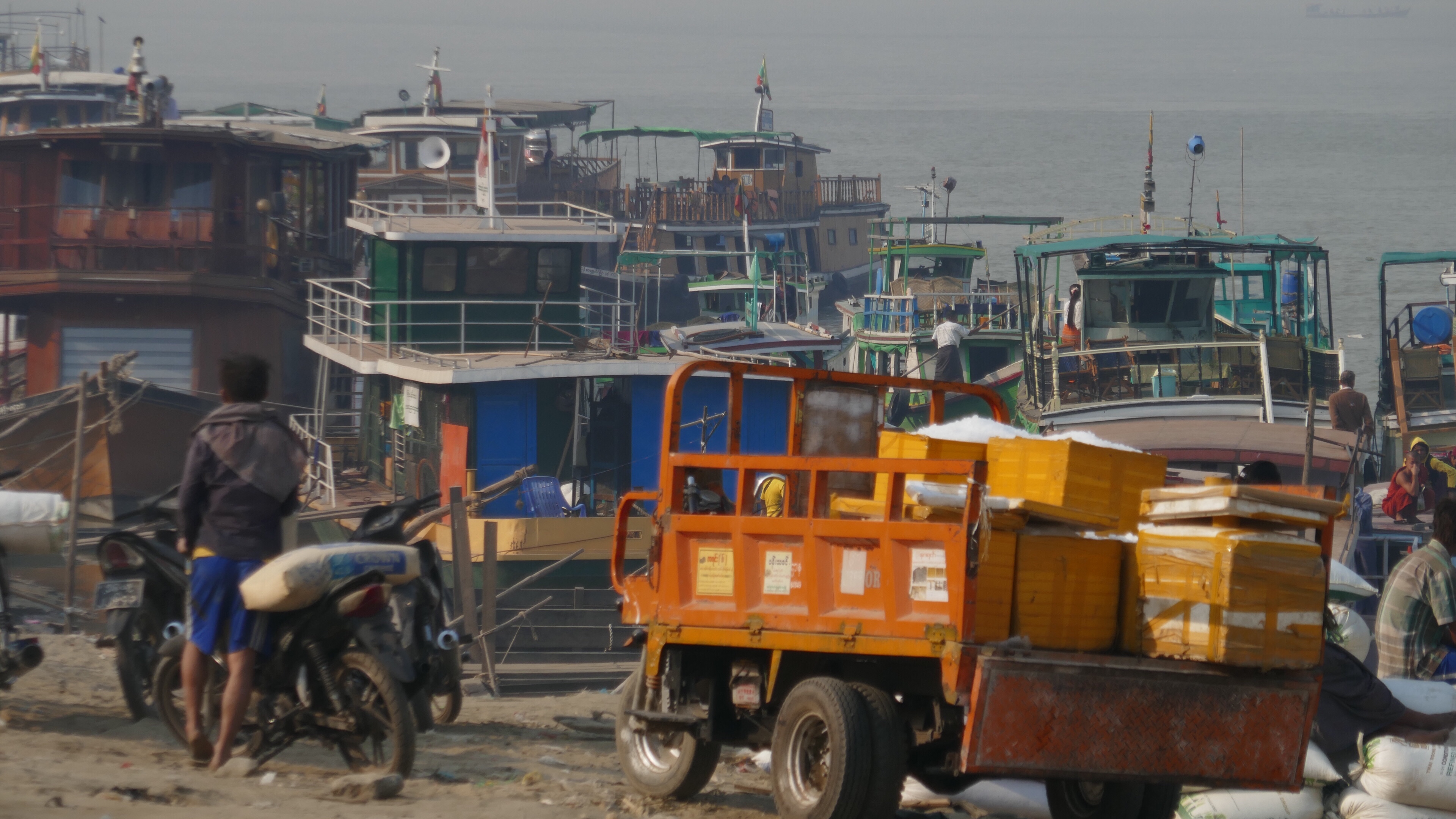 Vor der Strand Road fällt das Ufer sandig ab bis zum Fluss. Die Schiffe liegen hier in dreier bis fünfer Reihen. Einfache Planken verbinden sie mit dem Ufer. Kaianlagen und Anleger sind nicht zu sehen. Es wirkt wie vor hundert Jahren. Die Zentner-Säcke Reis werden auf den Schultern über die Planken an das Ufer balanciert. Die noch alterschwächeren Lastwagen werden beladen, oben auf sitzen die Männer und Frauen (!), die die Ladung auf und abladen. Die alten Hino-Lastwagen brauchen zwei bis drei Anläufe, bis sie die Rampe zur Straße hinauf schaffen, immer wieder muss ein Gehilfe herunterspringen und einen Balken hinter die Reifen legen, damit der Fahrer einen neuen Anlauf nehmen kann und der Lastwagen nicht unkontrolliert zurückrollt.