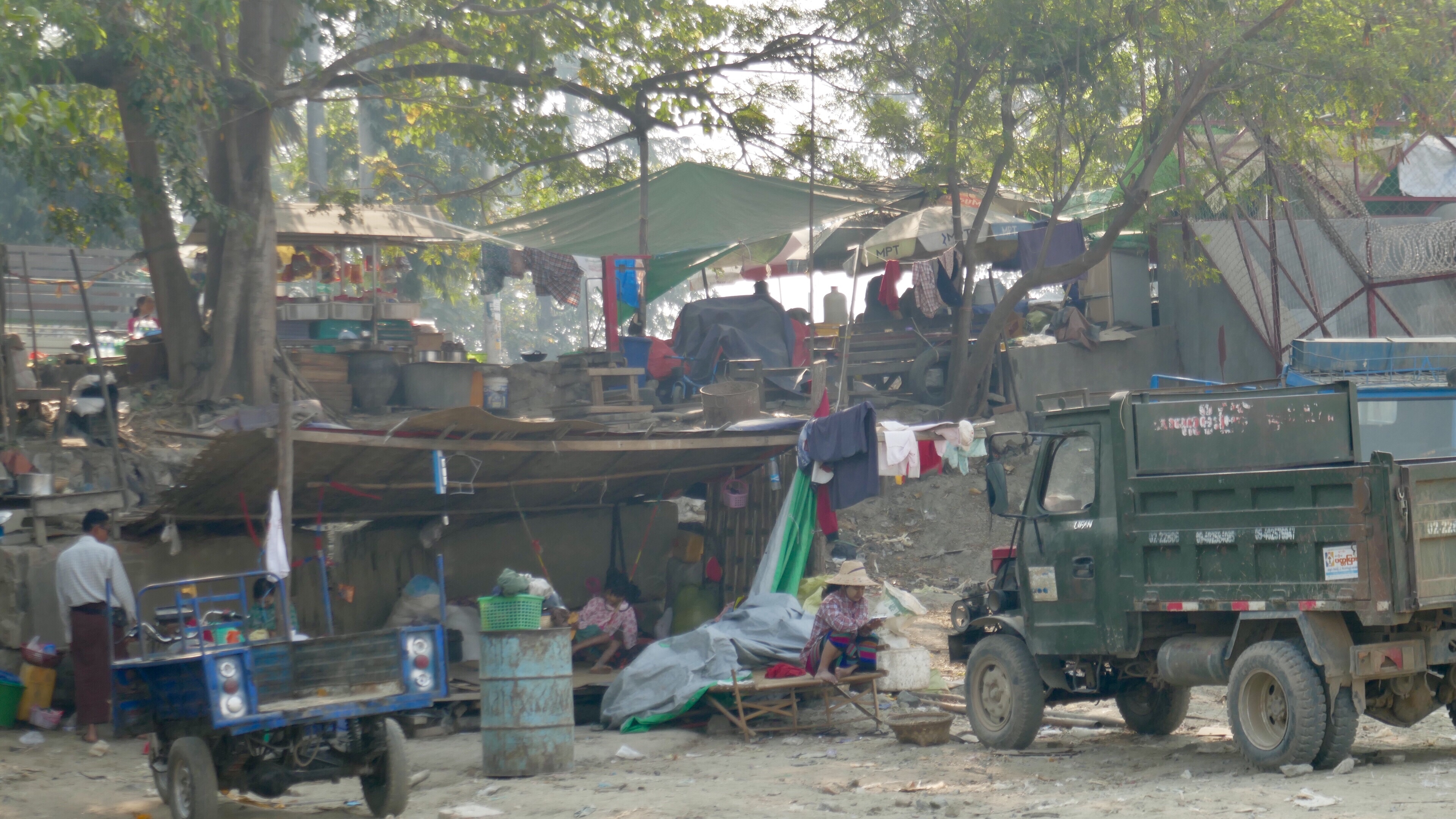 Die Strand Road suggeriert ein Flanieren am Fluss, einen Blick über den Ayeyawaddy mit schönem Sonnenuntergang. Auch hier sieht die Realität anders aus. Die Strand Road ist ein staubiges Stück an der Flussböschung, an der sich die Plastikplanen-Hütten entlangziehen. An der Strand Road liegt alles auf dem sandigen Boden, die Fische, die verkauft werden, liegen auf Plastikfolien zwischen den Fahrbahnen, die Bügelwäsche, die mit einem Bügeleisen geglättet wird, das seinen Namen noch wirklich verdient; Kinder, die alte Motorradreifen durch den Sand treiben. Unterbrochen wird die Szenerie immer wieder durch die kleinen Plastikhocker, auf denen die Menschen sitzen und essen und trinken.