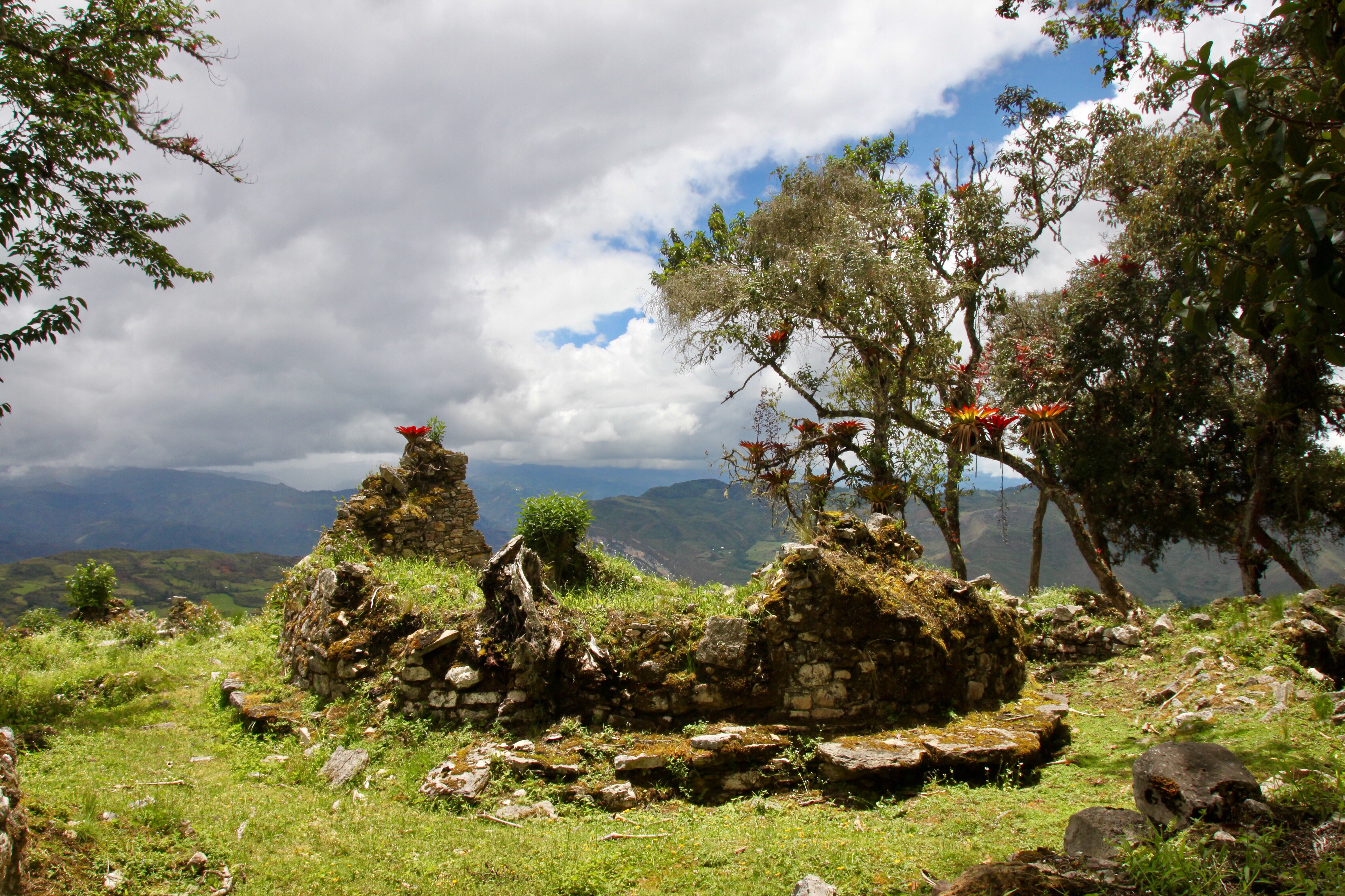 Alles Götter-Anbeten hat nichts genutzt, wir stehen weiterhin im Grau, dazu weht ein kalter Wind die Wolken aus dem Tal über den Pass. In der Ferne hören wie die Lawinen vom Salkantay herunterschlagen, aber sehen können wir nichts. Also den Abstieg beginnen und ins Tal zum nächsten Zeltplatz Chawllay. Regenzeug an und hinab zum Mittagessen. Plötzlich lassen wir die Wolkendecke über uns und rechts von uns breitet sich ein üppig grünes Tal aus, an dessen Grund ein rauschender Fluss sich hinzog. Wir mussten das Regenzeug ausziehen, um nicht total ins Schwitzen zu kommen. Wir waren über den Pass in eine andere Vegetationszone gelangt. Um uns herum war nun alles grün und nass, die Pflanzen üppig nach der kargen Vegetation beim Aufstieg.