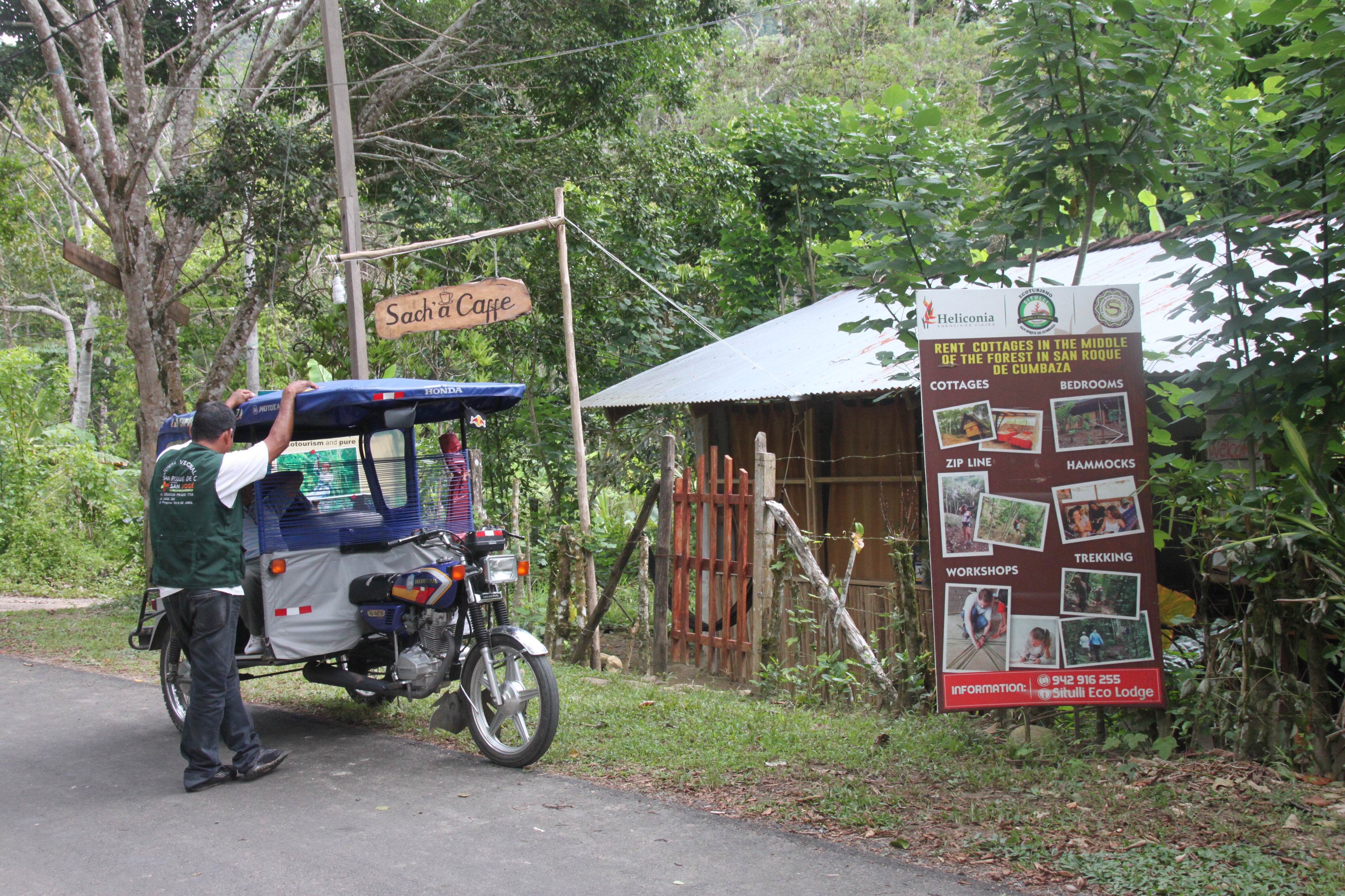 Jetzt ging es nur noch abwärts, und es wurde immer wärmer. Schmetterlinge begleiteten uns auf einem tollen Pfad durch das Tal des Rio Sacsara. Ab Playa Sahuayacco ging es mit einem Minibus auf atemberaubender Piste weiter, den Fluss auf ein Paar alten Bohlen überwindend. Der Vorderreifen unseres Bus gab dann auch bald auf und ließ seine Luft raus. Der Fahrer wechselte den Reifen mit erstaunlicher Routine unter den kritischen Augen der Gruppe.