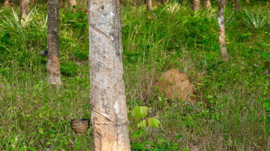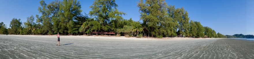 Unser Ziel ist ein kleiner orangener Punkt auf dem Smartphone. Der Punkt zeigt ein Doppelbett, ansonsten nur thailändische Buchstaben, für uns nicht zu entziffern. Der Punkt zeigt einen Ort an der Straße auf Google-Maps, an dem hoffentlich eine Unterkunft steht. Aus Bo Kulea haben wir die angegebene Telefonnummer über whatsapp angeschrieben, und Antwort bekommen. Die Unterkunft finden wir nur über die Entfernungsanzeige über Google-Maps. Als das „Sie haben Ihr Ziel erreicht“ ertönt, stehen wir vor einem Feldweg mit einem Schild in thailändischer Sprache. Keine Unterkunft zu sehen. Wir fahren durch eine Kautschuk-Plantage (nach Ko Phayam kann ich die Bäume erkennen) und treffen auf ganz neue, winzige Bambushüttchen. Eine junge Dame scheint uns zu erwarten.