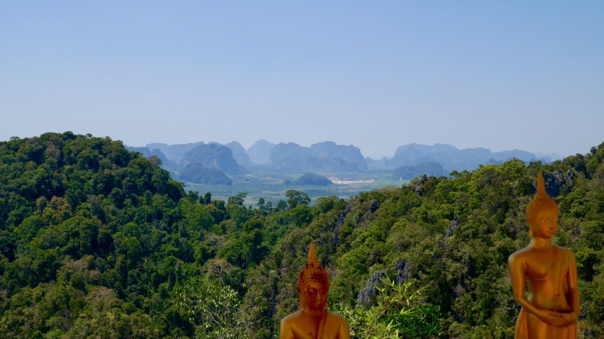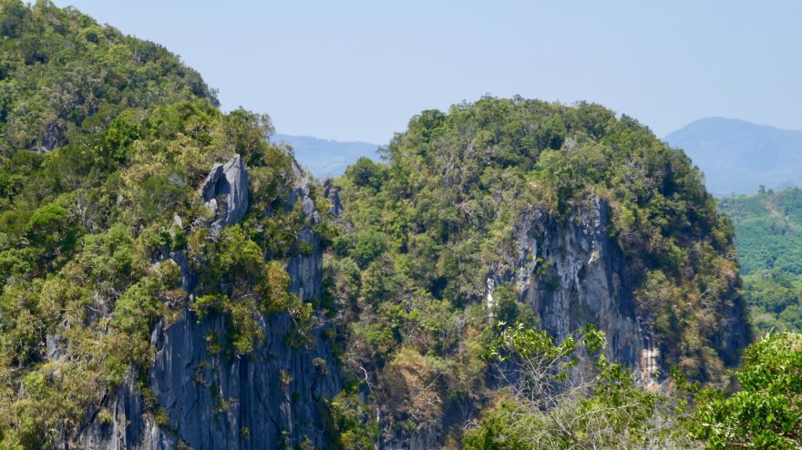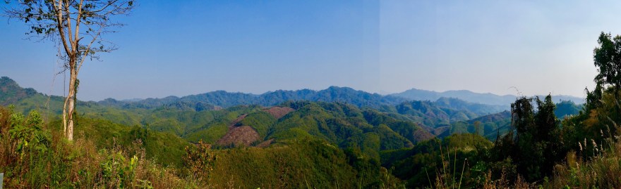 Nach dem ersten Tag auf den thailändischen Mopeds fahren wir am zweiten Tag souverän auf der Bergstraße in Richtung Pass zwischen Ost und West. Auf 1770m Höhe erreichen wir eine Aussichtsplattform mit Parkplatz und Essensverkauf. Der Blick geht über schöne bewaldete Hänge, nur die Fernsicht läßt die Mischung aus Dunst und Qualm kaum zu.