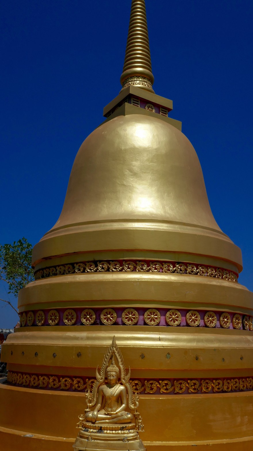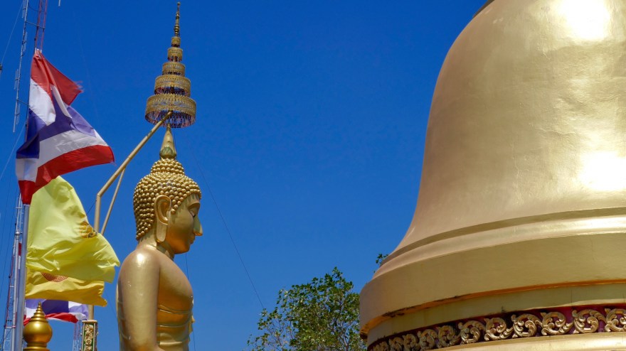 Plötzlich taucht eine weiße Pagode im grünen Blättermeer auf. Ein Tempel steht mitten in der Landschaft, der Buddha sitzt frei zwischen den Säulen. Dann wird die Landschaft gelber, weil die landwirtschaftliche Nutzung zunimmt und der Wald verschwindet. Die Sonne steht mittlerweile tief, die Felder sind abgeerntet und liegen im gelben Licht träge in der Landschaft.