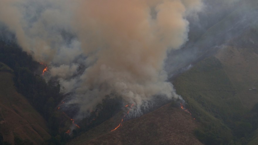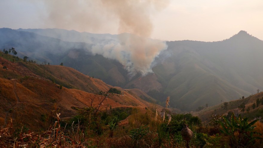 Orange ist aber auch die Farbe des Feuers, das auf der gegenüberliegenden Talseite brennt. Zuerst hören wir das knacken der berstenden Stämme und riechen den Rauch, bis wir den Motorroller an einer geeigneten Stelle am Straßenrand anhalten können und frei Sicht über das Tal bekommen. Orange ziehen sich die Flammen den Berghang hinauf, finden reichlich Nahrung im ausgetrockneten Pflanzenreich. Wir stehen zwischen vertrockneten Maispflanzen, deren Felder sich die Berghänge hochziehen.