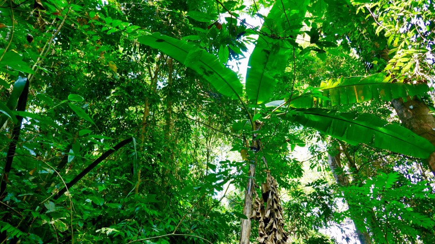 tauchen wir in die Artenvielfalt des Regenwaldes ein. Der Wald hier in 1300m Höhe ist ganz anders als der Regenwald in Südthailand bei Krabi. Die Bäume sind nicht ganz so hoch und es gibt richtige Bananenfelder im Wald. Die Bananenplanze kann in ihrem Stamm 10-15 Liter Wasser speichern, und trägt somit zur Wasserversorgung des Waldes in der Trockenzeit bei. Dafür fehlen hier die großen Bäume mit den Brettwurzeln.